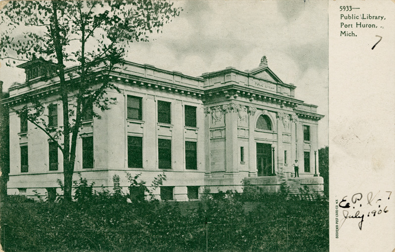 View of the Public Library in Port Huron, Michigan. Printed on front: "5933. Public Library, Port Huron, Mich. Souvenir Post Card Co." Handwritten on front: "E.P.W. July 1906."