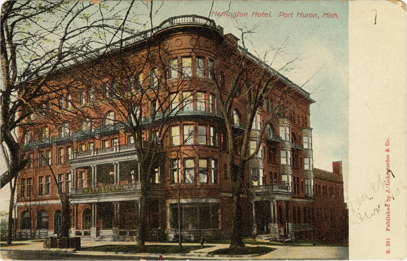 View of the Harrington Hotel in Port Huron, Michigan. Printed on front: "Harrington Hotel, Port Huron, Mich. S. 281. Published by J. Lohrstorfer & Co." Printed on back: "S. Langsdorf & Co., New York, Germany."
