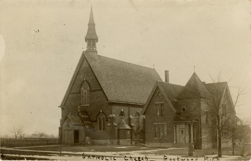 View of the Catholic church in Rockwood, Michigan. Printed on front: "Catholic Church, Rockwood, Mich." Handwritten on back: "July 31, 09. Arrived at Rockwood at last and having a fine rest, slept my head off the first day. Woke up just long enough to write this. Regards from all, Sister B." Card is postmarked August 2, 1909.