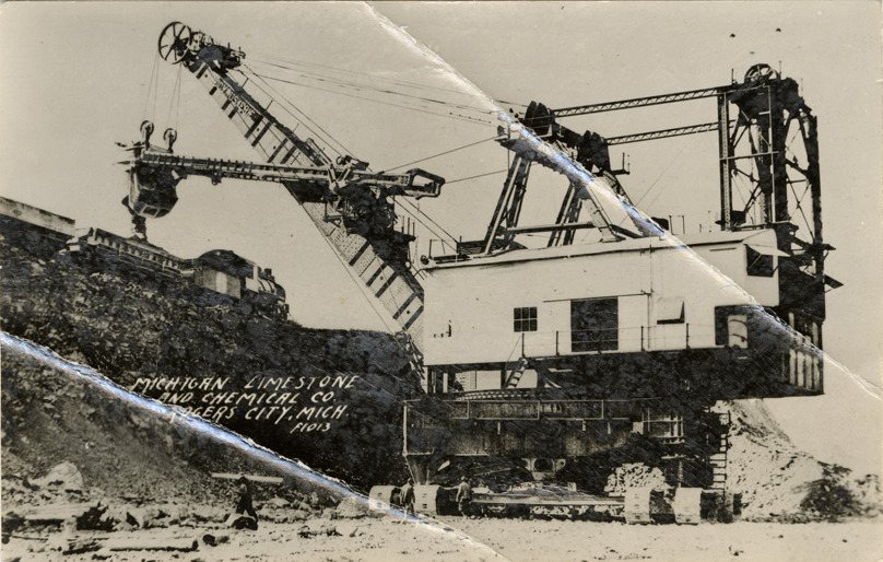 View of a power shovel at the Michigan Limestone and Chemical Company at Rogers City, Michigan. Printed on front: "Michigan Limestone and Chemical Co., Rogers City, Mich."