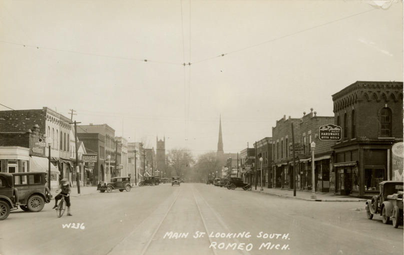 View of commercial buildings and cars on Main St. in Romeo, Michigan. Printed on front: "Main St. looking south, Romeo, Mich."
