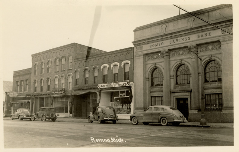 Favorite this☆ Romeo Savings Bank, Baker's Market and Mid-Way Restaurant, Romeo, Michigan Description: View of Romeo Savings Bank, Baker's Market and Mid-Way Restaurant in Romeo, Michigan. Cars are parked in street. Printed on front: "Romeo, Mich." Details Resource ID: bh021659 Subject: Streets--Michigan--Romeo Bank buildings--Michigan--Romeo Grocery stores--Michigan--Romeo Restaurants--Michigan--Romeo Automobiles--Michigan--Romeo Photographic prints Postcards Date Issued: Unknown year Format: 1 postcard ; 3.5 x 5.5 in. Member of: Burton Historical Collection Filing Location: M/Localities-Romeo Rights: Physical rights are retained by DPL. Copyright is retained in accordance with U.S. copyright laws.