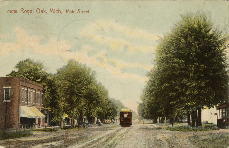 View of streetcar and commercial buildings on Main St. in Royal Oak, Michigan. Printed on front: "01075. Royal Oak, Mich. Main Street." Printed on back: "Published by Backenstose Bookstore, Pontiac, Mich. Made in Germany." Handwritten on back: "Friend Myron, Aunt [undecipherable] told me you would like those [undecipherable]. I hope you will get them all right. I wish you a Merry Christmas, Will Curtis." Card is postmarked December 24, 1907.