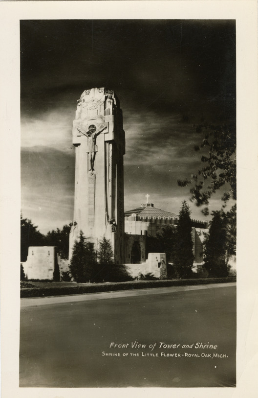 Favorite this☆ Shrine of the Little Flower, Royal Oak, Michigan Description: View of the Shrine of the Little Flower Catholic church in Royal Oak, Michigan. Printed on front: "Front view of tower and shrine, Shrine of the Little Flower, Royal Oak, Mich." Details Resource ID: bh021665 Subject: Shrine of the Little Flower (Royal Oak, Mich.) Catholic church buildings--Michigan--Royal Oak Photographic prints Postcards Date Issued: Unknown year Format: 1 postcard ; 5.5 x 3.5 in. Member of: Burton Historical Collection Filing Location: M/Localities-Royal Oak Rights: Physical rights are retained by DPL. Copyright is retained in accordance with U.S. copyright laws.