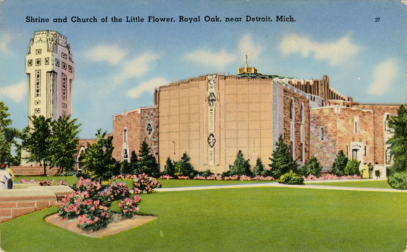 View of the Shrine of the Little Flower Catholic church in Royal Oak, Michigan. Printed on front: "Shrine and church of the Little Flower, Royal Oak, near Detroit, Mich." Printed on back: "Headquarters of the Rev. Charles E. Coughlin, the famous radio priest, was built largely through the contribution of his listeners. Located at the corner of Woodward and Twelve Mile Road, the shrine is noted for its enormous crucifix, the largest in the world. Pub. by Chaffee & Co., Inc., Detroit, Mich. Tichnor Gloss. Quality views. Reg. U.S. Pat. Off. Made only by Tichnor Bros., Inc., Boston 15, Mass."