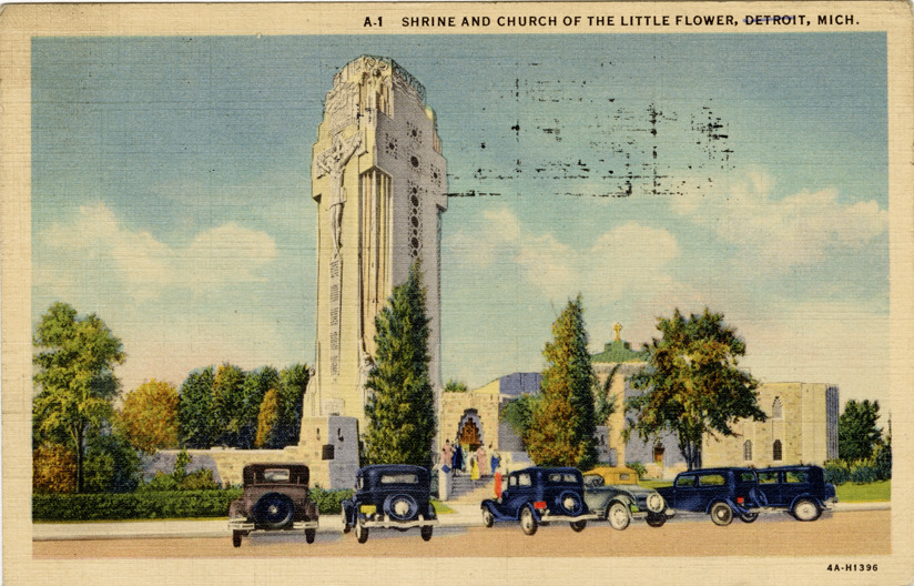 View of the Shrine of the Little Flower Catholic church in Royal Oak, Michigan. Printed on front: "A-1. Shrine and Church of the Little Flower, Detroit, Mich." Printed on back: "C.T. Art Colortone. Reg. U.S. Pat. Off. Made only by Curt Teich & Co., Inc., Chicago." Handwritten on back: "Dear Lena, Well old timer, how are you after all this hot weather. I wasn't well when I left home but am fine now. Having a nice time, Love, [undecipherable]." Card is postmarked August 15, 1936.