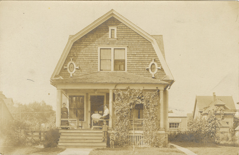 View of women and children posing on the porch of a two-story, wooden-frame house with gambrel roof in Saginaw, Michigan. Handwritten on back: "How is baseball. Very busy and all are well." Card is postmarked October 10, 1909.