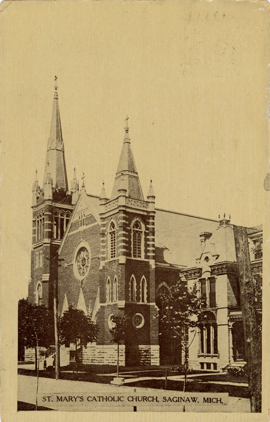 View of Cathedral of Mary of the Assumption in Saginaw, Michigan. Printed on front: "St. Mary's Church, Saginaw, Mich." Printed on back: "Pub. by Western Post Card Co., Detroit, Mich." Handwritten on back: "Dear Brother, Hope you are well, will write soon. This is a pretty church. I thought I would send it, your loving sister, B." Card is postmarked July 21, 1911.