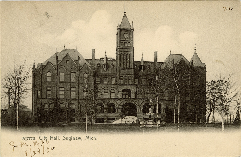 Favorite this☆ City Hall, Saginaw, Michigan Description: View of the City Hall in Saginaw, Michigan. Printed on front: "A 7776. City Hall, Saginaw, Mich." Handwritten on front: "J.M.W. 20. 8/29/06." Printed on back: "The Rotograph Co., N.Y., City, (Germany)." Details Resource ID: bh021701 Subject: City halls--Michigan--Saginaw Postcards Publisher: Rotograph Co. Date Issued: 1913 (year approximate) Format: 1 postcard ; 3.5 x 5.5 in. Member of: Burton Historical Collection Filing Location: M/Localities-Saginaw Rights: Physical rights are retained by DPL. Copyright is retained in accordance with U.S. copyright laws.
