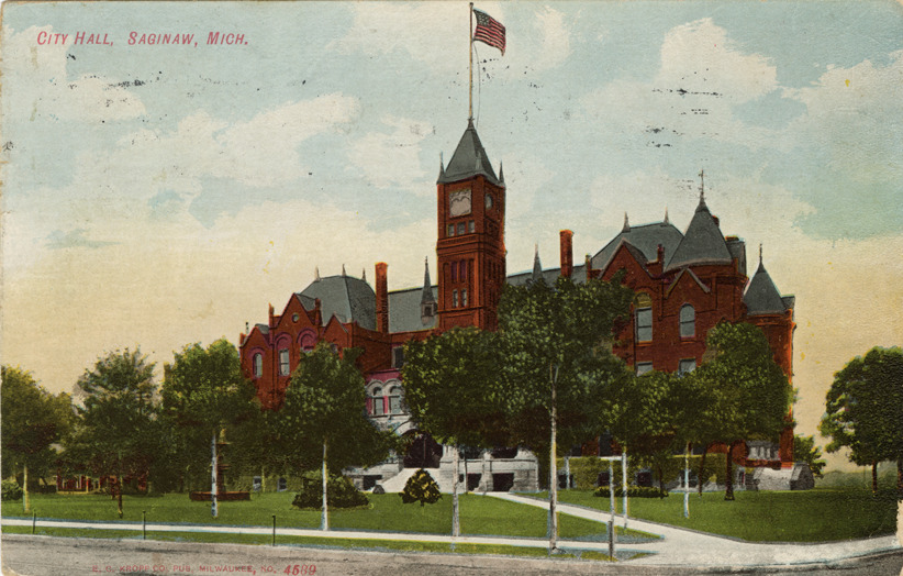View of the City Hall in Saginaw, Michigan. Printed on front: "City Hall, Saginaw, Mich. E.C. Kropp Co., Milwaukee, no. 4589." Handwritten on back: "Dear Pat, Here is where the politicians gather and transackt [sic] the business of the people. W.A." Card is postmarked May 1, 1909.