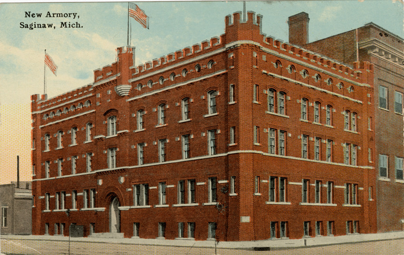 View of the Armory in Saginaw, Michigan. Printed on front: "New Armory, Saginaw, Mich." Printed on back: "Published expressly for S.H. Knox & Co. Made in U.S.A."