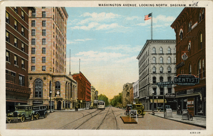 View of commercial buildings and cars on Washington Ave. in Saginaw, Michigan. Printed on front: "Washington Avenue looking north, Saginaw, Mich." Printed on back: "Published by Saginaw Woodenware Co., Saginaw, Mich. C.T. American Art Colored. CT Co., Chicago."