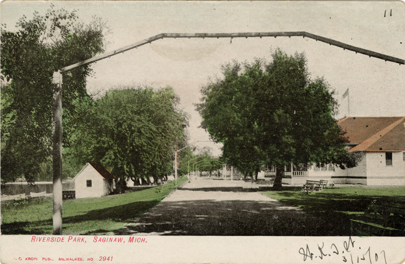 Favorite this☆ Riverside Park, Saginaw, Michigan Description: View of Riverside Park in Saginaw, Michigan. Printed on front: "Riverside Park, Saginaw, Mich. E.C. Kropp, publ. Milwaukee, no. 2941." Handwritten on front: "W.K.J.W. 3/15/07." Details Resource ID: bh021735 Subject: Parks--Michigan--Saginaw Park buildings--Michigan--Saginaw Postcards Publisher: E.C. Kropp Co. Date Issued: Unknown year Format: 1 postcard : col. ; 3.5 x 5.5 in. Member of: Burton Historical Collection Filing Location: M/Localities-Saginaw Rights: Physical rights are retained by DPL. Copyright is retained in accordance with U.S. copyright laws.