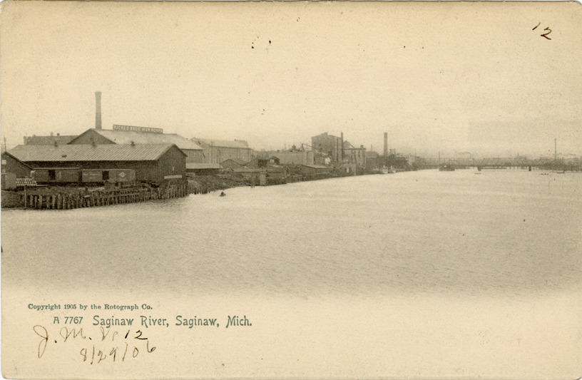 View of factories along the Saginaw River in Saginaw, Michigan. Printed on front: "A 7767 Saginaw River, Saginaw, Mich. Copyright 1905 by the Rotograph Co." Handwritten on front: "J.M.W. 12. 8/29/06." Printed on back: "The Rotograph Co., N.Y., City, (Germany)."