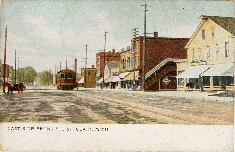 Favorite this☆ Front Street, St. Clair, Michigan Description: View of commercial buildings and streetcar on Front St. in St. Clair, Mich. Printed on front: "East side Front St., St. Clair, Mich." Printed on back: "Chas. H. Werner & Sons Co., Detroit, Mich. Made in Germany." Details Resource ID: bh021748 Subject: Streets--Michigan--Saint Clair Cable cars (Streetcars)--Michigan--Saint Clair Commercial buildings--Michigan--Saint Clair Postcards Publisher: Chas. H. Werner & Sons Co. Curt Teich & Co. Date Issued: Unknown year Format: 1 postcard : col. ; 3.5 x 5.5 in Member of: Burton Historical Collection Filing Location: M/Localities-St. Clair Rights: Physical rights are retained by DPL. Copyright is retained in accordance with U.S. copyright laws.