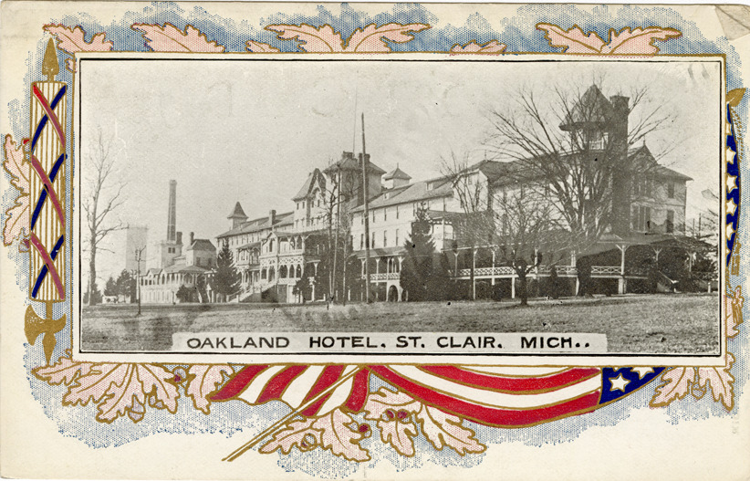Favorite this☆ Oakland Hotel, St. Clair, Michigan Description: View of the Oakland Hotel in St. Clair, Mich., framed by a decorative border of an American flag and oak leaves. Printed on front: "Oakland Hotel, St. Clair. Mich." Printed on back: "Michigan Calendar Co., Detroit." Details Resource ID: bh021753 Subject: Hotels--Michigan--Saint Clair Postcards Publisher: Michigan Calendar Co. Date Issued: Unknown year Format: 1 postcard : col. ; 3.5 x 5.5 in Member of: Burton Historical Collection Filing Location: M/Localities-St. Clair Rights: Physical rights are retained by DPL. Copyright is retained in accordance with U.S. copyright laws.