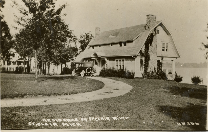 Favorite this☆ Wooden-frame house, St. Clair, Michigan Description: View of a car parked in front of a two-story, wooden-frame house with gambrel roof in St. Clair, Mich. Printed on front: "Residence on St. Clair River, St. Clair, Mich." Details Resource ID: bh021756 Subject: Wooden-frame houses--Michigan--Saint Clair Automobiles--Michigan--Saint Clair Photographic prints Postcards Date Issued: Unknown year Format: 1 postcard ; 3.5 x 5.5 in Member of: Burton Historical Collection Filing Location: M/Localities-St. Clair Rights: Physical rights are retained by DPL. Copyright is retained in accordance with U.S. copyright laws.