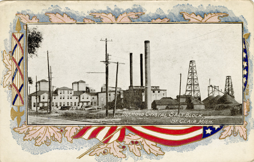 Favorite this☆ Diamond Crystal Salt Block, St. Clair, Michigan Description: View of the Diamond Crystal Salt Block factory in St. Clair, Mich., framed by a decorative border of an American flag and oak leaves. Printed on front: "Diamond Crystal Salt Block, St. Clair. Mich." Printed on back: "Michigan Calendar Co., Detroit." Details Resource ID: bh021767 Subject: Salt industry and trade--Michigan--Saint Clair Factories--Michigan--Saint Clair Postcards Publisher: Michigan Calendar Co. Date Issued: Unknown year Format: 1 postcard : col. ; 3.5 x 5.5 in Member of: Burton Historical Collection Filing Location: M/Localities-St. Clair Rights: Physical rights are retained by DPL. Copyright is retained in accordance with U.S. copyright laws.