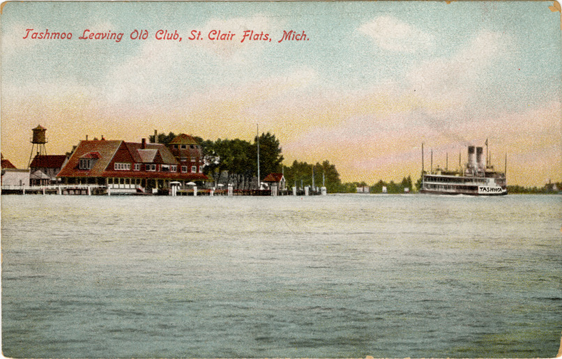 View of the steamer "Tashmoo" leaving the Old Club at St. Clair Flats, Michigan. Printed on front: "Tashmoo leaving Old Club, St. Clair Flats, Mich." Printed on back: "Published by Wolverine News Co., Detroit, Mich. and Leipzig, Germany. No. 720. Made in Germany."