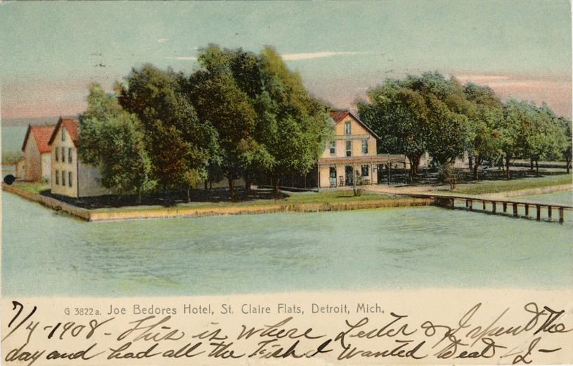 View of Joe Bedore's Hotel, St. Clair Flats, Michigan. Printed on front: "G 3822a. Joe Bedore's Hotel, St. Claire [sic] Flats, Detroit, Mich." Handwritten on front: "7/4-1908. This is where Lester & I spent the day and had all the fish I wanted to eat. L." Printed on back: "The Rotograph Co., N.Y., City, (Germany)."