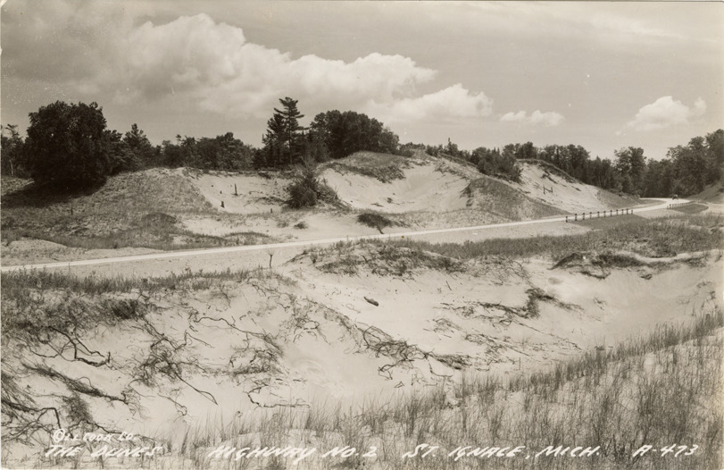 Favorite this☆ Dunes along Highway No. 2, St. Ignace, Michigan Description: View of sand dunes along Highway No. 2 at St. Ignace, Michigan. Printed on front: "The dunes, Highway No. 2, St. Ignace, Mich. [copyright] L.L. Cook Co." Printed on back: "All rights reserved. The L.L. Cook Co., Milwaukee." Details Resource ID: bh021803 Subject: Sand dunes--Michigan--Saint Ignace Roads--Michigan--Saint Ignace Photographic prints Postcards Publisher: L.L. Cook Co. Date Issued: Unknown year Format: 1 postcard ; 3.5 x 5.5 in. Member of: Burton Historical Collection Filing Location: M/Localities-St. Ignace Rights: Physical rights are retained by DPL. Copyright is retained in accordance with U.S. copyright laws.