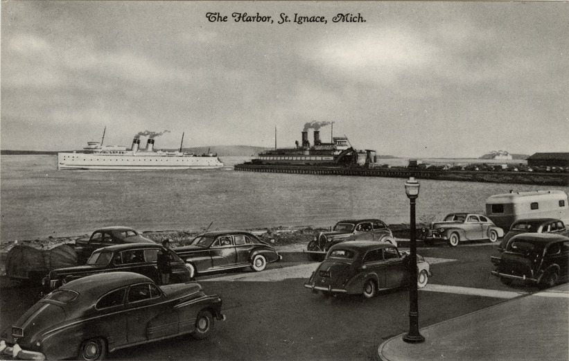 View of cars traveling along harbor at St. Ignace, Michigan. Ships in background. Printed on front: "The harbor, St. Ignace, Mich." Printed on back: "Wickman's Photo Shop. Genuine Curteich-Chicago 'C.T. Photo-Cote' post card (reg. U.S. Pat. Off.)
