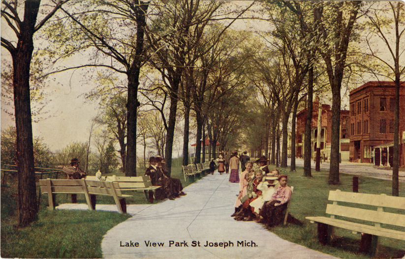 Favorite this☆ Lake View Park, St. Joseph, Michigan Description: View of men, women and children at Lake View Park in St. Joseph, Michigan. Commercial buildings in background. Printed on front: "Lake View Park, St. Joseph, Mich." Printed on back: "Bradford & Co., St. Joseph, Mich., publishers." Details Resource ID: bh021834 Subject: Parks--Michigan--Saint Joseph Benches--Michigan--Saint Joseph Postcards Publisher: Bradford & Co. Date Issued: Unknown year Format: 1 postcard : col. ; 3.5 x 5.5 in. Member of: Burton Historical Collection Filing Location: M/Localities-St. Joseph Rights: Physical rights are retained by DPL. Copyright is retained in accordance with U.S. copyright laws.