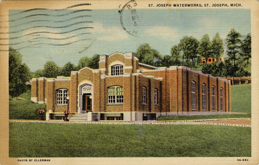 View of the St. Joseph Waterworks building in St. Joseph, Michigan. Printed on front: "St. Joseph Waterworks, St. Joseph, Mich. Photo by Ellerman." Printed on back: "Twin City News Agency, Benton Harbor, St. Joseph, Mich. Genuine Curteich-Chicago 'C.T. Art-Colortone' post card (reg. U.S. Pat. Off.)" Handwritten on back: "Dear Helen, If you wish to [undecipherable] it is O.K. I know it is hard to get nice cards now and the plastics do cost. Sincerely, Mrs. Mae Brotemarkle." Card is postmarked April 26, 1954.