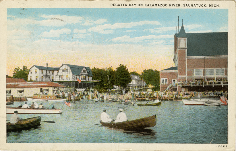 View of boaters at Regatta Day on the Kalamazoo River at Saugatauk, Michigan. Printed on front: "Regatta Day on Kalamazoo River, Saugatauk, Mich." Printed on back: "Published by Parrish & Simonson, Saugatauk, Mich. Made in U.S.A. C.T. American Art Colored. CT Co., Chicago." Handwritten on back: "Dear Cliff, Having a fine time. Can swim a little now. We all will go to [undecipherable] pool next week. Father." Card is postmarked August 17, 1928.