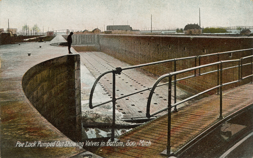 View of the Poe Lock emptied of water, Soo Locks, Sault Ste. Marie, Michigan. Printed on front: "Poe Lock pumped out showing valves in bottom, Soo, Mich." Printed on back: "667. Pub. by Young, Lord & Rhoades. Made in Germany."