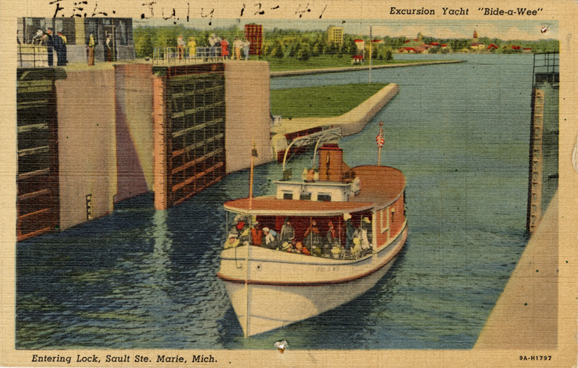 View of the excusion boat "Bide-a-Wee' entering Soo Locks, Sault Ste. Marie, Michigan. Printed on front: "Excusion yacht "Bide-a-Wee' entering lock, Sault Ste. Marie, Mich." Printed on back: "Tourists enjoying the thrill of a trip thru the famous 'Soo' Locks. This trip gives one an idea of the gigantic size of the locks. Printed on back: "Published exclusively for A.E. Young, Sault Ste. Marie, Mich. Genuine Curteich-Chicago 'C.T. Art-Colortone' post card (reg. U.S. Pat. Off.)" Handwritten on back: "July 10-41. Arvd O.K. every one well. Nights right cool. Expect to see Ina Palmer soon. May get a [undecipherable] at lake trout fishing, am not certain." Card is postmarked July 10, 1941.