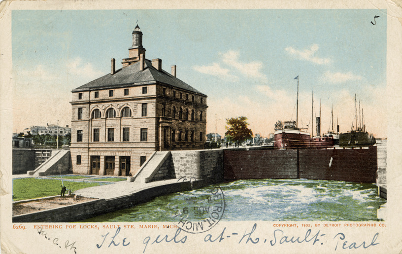 View of the power house at the Poe Lock, Soo Locks, Sault Ste. Marie, Michigan. Freighters in background. Printed on front: "6269. Entering Poe Locks, Sault Ste. Marie, Mich. Copyright 1902 by Detroit Photographic Co." Handwritten on front: "M.C.W. The girls at the Sault. Pearl." Card is postmarked August 2, 1905.