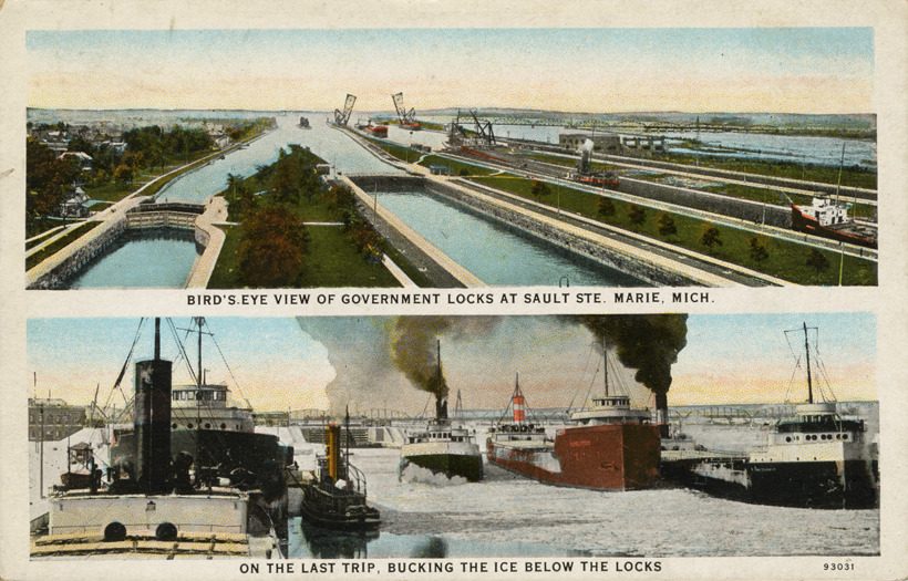 Two separate views of the Soo Locks and freighters traveling through ice at Sault Ste. Marie, Michigan. Printed on front: "Bird's-eye view of government locks at Sault Ste. Marie, Mich. On the last trip, bucking the ice below the locks." Printed on back: "Published exclusively for A.E. Young, Sault Ste. Marie, Mich. C.T. American Art Colored. CT Co., Chicago."