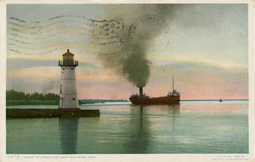 View of a lighthouse and freighter at Sault Ste. Marie, Michigan. Printed on front: "11873. Sunset at upper light, Sault Ste. Marie, Mich. Copyright 1908 by Detroit Publishing Co." Printed on back: "Phostint card. Made only by Detroit Publishing Co." Handwritten on back: "Dear Friend, We have enough to eat but I wish I had some of that good bread you make. Helen." Card is postmarked August 31, 1908.