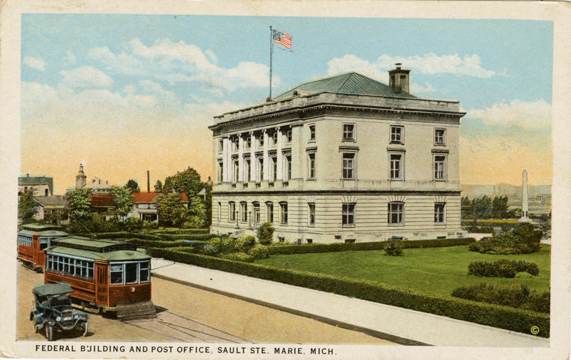 View of the U.S. Post Office and Federal Building in Sault Ste. Marie, Michigan. Streetcar and car in foreground. Printed on front: "Federal Building and Post Office, Sault Ste. Marie, Mich." Printed on back: "Copyrighted & published exclusively for A.E. Young, Sault Ste. Marie, Mich. C.T. American Art. CT Co., Chicago." Handwritten message on back.