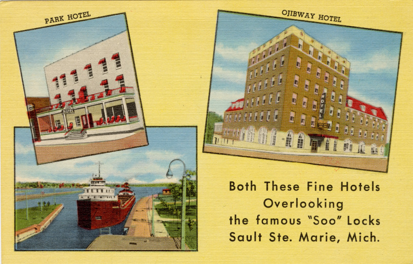 Three separate views of the Park Hotel, the Ojibway Hotel and a freighter in the Soo Locks, Sault Ste. Marie, Michigan. Printed on front: "Park Hotel, Ojibway Hotel. Both these fine hotels overlooking the famous Soo Locks, Sault Ste. Marie, Mich." Printed on back: "Leon A. Deglman Hotels overlooking the famous Soo Locks, hay fever mecca of the world. Genuine Curteich-Chicago 'C.T. Art-Colortone' post card (reg. U.S. Pat. Off.)"