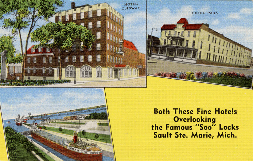 Three separate views of the Park Hotel, the Ojibway Hotel and a freighter in the Soo Locks, Sault Ste. Marie, Michigan. Printed on front: "Hotel Park, Hotel Ojibway. Both these fine hotels overlooking the famous Soo Locks, Sault Ste. Marie, Mich." Printed on back: "Leon A. Deglman Hotels overlooking the famous Soo Locks, hay fever mecca of the world. Natural color postcard made in U.S.A. by E.C. Kropp Co., Milwaukee, Wis. IBY."