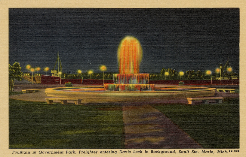 Nighttime view of illuminated fountain at Government Park in Sault Ste. Marie, Michigan. Printed on front: "Fountain in Government Park, freighter entering Davis Lock in background, Sault Ste. Marie, Mich." Printed on back: "Published exclusively for Frank T. Patyk, Sault Ste. Marie, Mich. Genuine Curteich-Chicago 'C.T. Art-Colortone' post card (reg. U.S. Pat. Off.)"