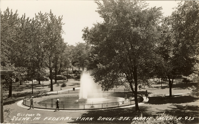 View of fountain at Government Park in Sault Ste. Marie, Michigan. Printed on front: "Scene in Federal Park, Sault Ste. Marie, Mich. [copyright] L.L. Cook Co." Printed on back: "All rights reserved. The L.L. Cook Co., Milwaukee."