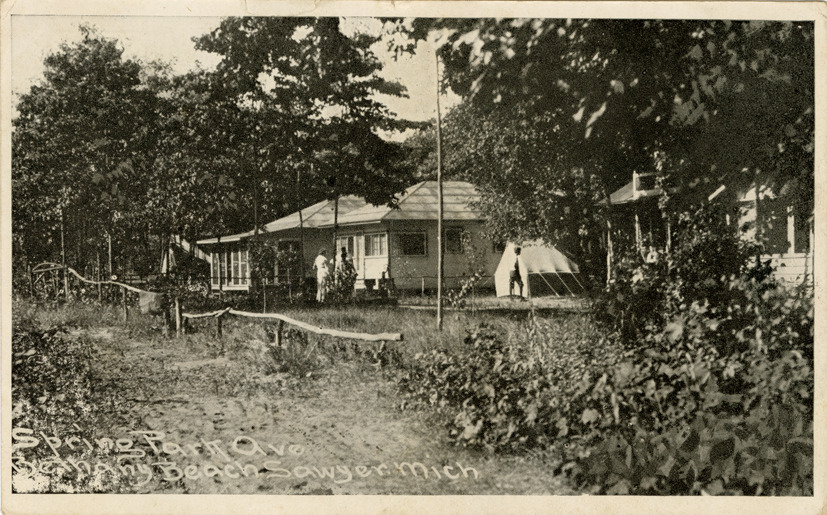 View of wooden-frame houses and a tent on Spring Park Ave. at Bethany Beach, Sawyer, Michigan. Printed on front: "Spring Park Ave., Bethany Beach, Sawyer, Mich." Handwritten on back: "Bethany Beach, 7/6/18. Half of my time gone. Wish I had just come out. Things are just fine out here. Regards." Card is postmarked July 8, 1918.