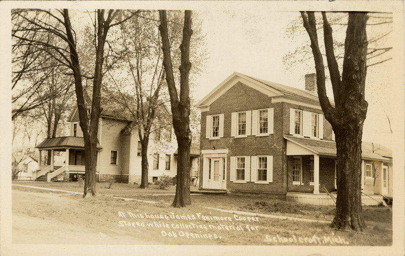 View of brick house in Schoolcraft, Michigan, where James Fenimore Cooper resided while researching 'Oak openings.' Wooden-frame house on left. Printed on front: "At this house James Fenimore Cooper stayed while collecting material for Oak Openings. Schoolcraft, Mich." Handwritten message on back.