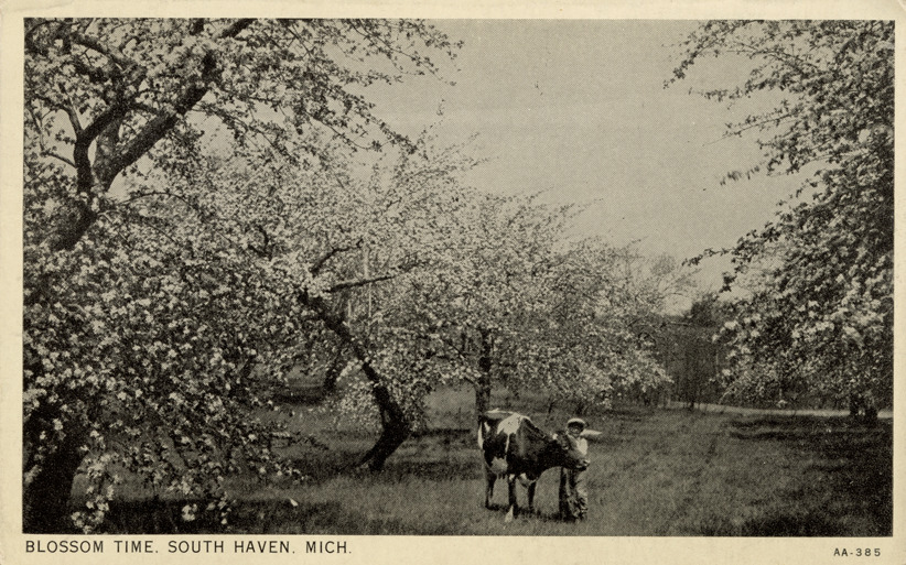 View of a boy with cow in an orchard of flowering fruit trees in South Haven, Michigan. Printed on front: "Blossom time, South Haven, Mich." Printed on back: "Pub. by Lockway-Stouck Paper Co., Benton Harbor, Mich. Mfg. by Fort Wayne Printing Co., Fort Wayne, Ind." Handwritten on back: "Having a good time bin [sic] to camp meeting. Hopkings." Card is postmarked August 7, 1934.