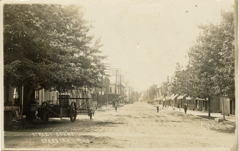 Favorite this☆ Street, Standish, Michigan Description: View of commercial buildings on an unidentified street in Standish, Mich. Farm equipment in foreground. Printed on front: "Street scene, Standish, Mich. Wasson, photo." Details Resource ID: bh022012 Creator: Wasson, Elmer J. Subject: Streets--Michigan--Standish Commercial buildings--Michigan--Standish Farm equipment--Michigan--Standish Photographers--Michigan Photographic prints Postcards Date Issued: Unknown year Format: 1 postcard ; 3.5 x 5.5 in. Member of: Burton Historical Collection Filing Location: M/Localities-Standish Rights: Physical rights are retained by DPL. Copyright is retained in accordance with U.S. copyright laws.