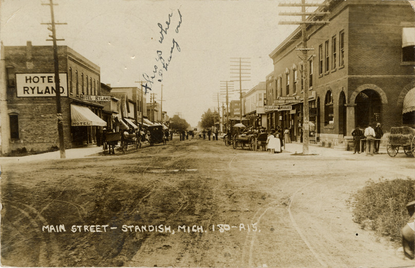 View of commercial buildings and horse-drawn vehicles on Main St. in Standish, Mich. Hotel Ryland in foreground. Printed on front: "Main Street, Standish, Mich." Handwritten on front: "This is where I hang out." Handwritten on back: "Dear Florence, Just a line to let you know I've not forgotten you. Would like very much to see you. I am clerking again, and like it better than sewing. Am quite well. Mother is in Bay City has been with Vella 6 weeks today. They have a new baby boy there. You see I've been living alone all this time, me & the cat. I call her Muggens, she follows me around about like Bill used to. Give my love to all, Your cousin, Lue. Write me a letter cousin. I have been working since May 10." Card is postmarked July 8, 1911.
