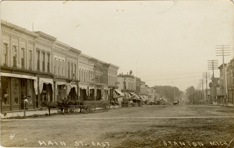 View of commercial buildings on Camburn Ave. in Stanton, Mich. Horse-drawn wagon on left. Printed on front: "Main St. East, Stanton, Mich." Handwritten on back: "Hello Eva, How are you folks. You think that I was not going to right [sic]. Are you going up to Cadillac soon. Good by. L.R.F." Card is postmarked May 24, 1911.