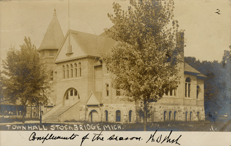 View of the Town Hall in Stockbridge, Michigan. Printed on front: "Town Hall, Stockbridge, Mich." Handwritten on front: "Compliments of the season [undecipherable]." Card is postmarked December 26, 1906.