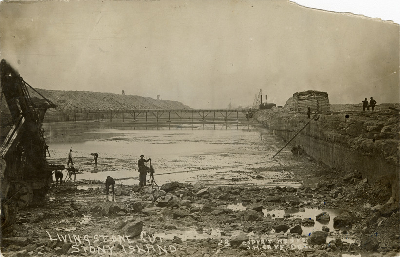 Favorite this☆ Workers at Livingstone cut, Stony Island Description: View of workers at the Livingstone Channel; channel being cut through stone at Stony Island. Printed on front: "Livingstone cut, Stony Island. Copyr't res'v'd. J.H. Cave, Det." Card is postmarked July 1910. Details Resource ID: bh022027 Creator: Cave, John H. Subject: Detroit River (Mich. and Ont.)--Channels Channels (Hydraulic engineering)--Ontario--Amherstburg Channels (Hydraulic engineering)--Design and construction Photographers--Michigan--Detroit Photographic prints Postcards Date Issued: 1910 (year approximate) Format: 1 postcard ; 3.5 x 5.5 in. Member of: Burton Historical Collection Filing Location: M/Localities-Stony Island Rights: Physical rights are retained by DPL. Copyright is retained in accordance with U.S. copyright laws.