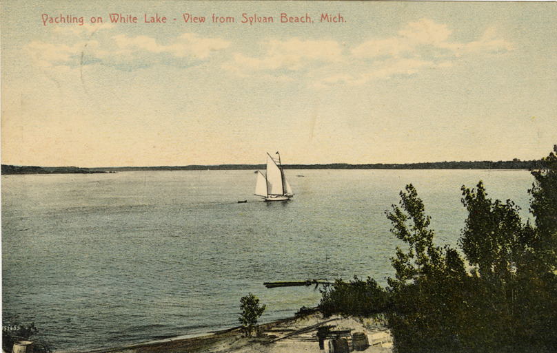 View of yacht on White Lake at Sylvan Beach, Michigan. Printed on front: "Yachting on White Lake. View from Sylvan Beach, Mich." Printed on back: "C.G. Pitkin & Co., importers and publishers, Whitehall, Mich. No. 257. Made in Germany." Handwritten on back: "Dear Lux, Don't send my trunk. I'm coming back to Kal. for a day or two as Anne insists upon my going somewhere with her. She sent me a draft today. Telegraph me if the trunk has gone. Eve & I come Monday." Card is postmarked July 10, 1908.