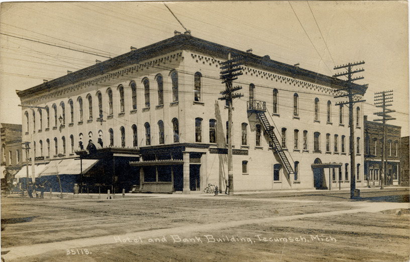 View of the Tecumseh State Savings Bank and hotel in Tecumseh, Michigan. Printed on front: "Hotel and bank building, Tecumseh, Mich." Printed on back: "C.R. Childs, photograph post cards, Chicago." Handwritten on back: "Dear Maura, Am here & had a nice ride too. Will phone tonight. Having a fine time. With love, B.E.C." Card is postmarked July 19, 1913.