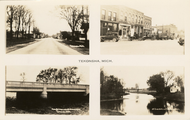 Favorite this☆ Four views of Tekonsha, Michigan Description: Four views of Tekonsha, Michigan, showing roads, commercial buildings, bridge and St. Joseph River. Printed on front: "Tekonsha, Mich. New bridge over St. Joseph River, Tekonsha, Mich. St. Joseph River, Tekonsha, Mich." Details Resource ID: bh022053 Subject: Streets--Michigan--Tekonsha Bridges--Michigan--Tekonsha Saint Joseph River (Mich. and Ind.) Photographic prints Postcards Date Issued: Unknown year Format: 1 postcard ; 3.5 x 5.5 in. Member of: Burton Historical Collection Filing Location: M/Localities-Tekonsha Rights: Physical rights are retained by DPL. Copyright is retained in accordance with U.S. copyright laws.
